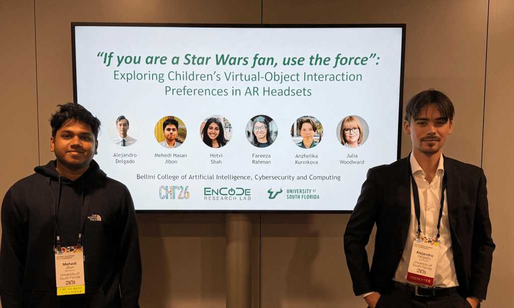 The EnCoDe Research lab had a full paper accepted to CHI 2026 “If you are a Star Wars fan, use the force”: Exploring Children’s Virtual-Object Interaction Preferences in AR Headsets! Alejandro and Mehedi traveled to Barcelona from April 11 – April 18 2026 to present our paper at the conference. Check out the paper!